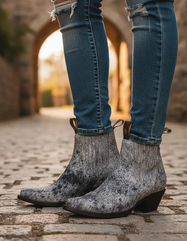Comprando esta publicación obtienes unas botines vaqueros de pelo para dama de piel de res Vacuno 100%, Originales Marca HORSAG, hechas a mano.